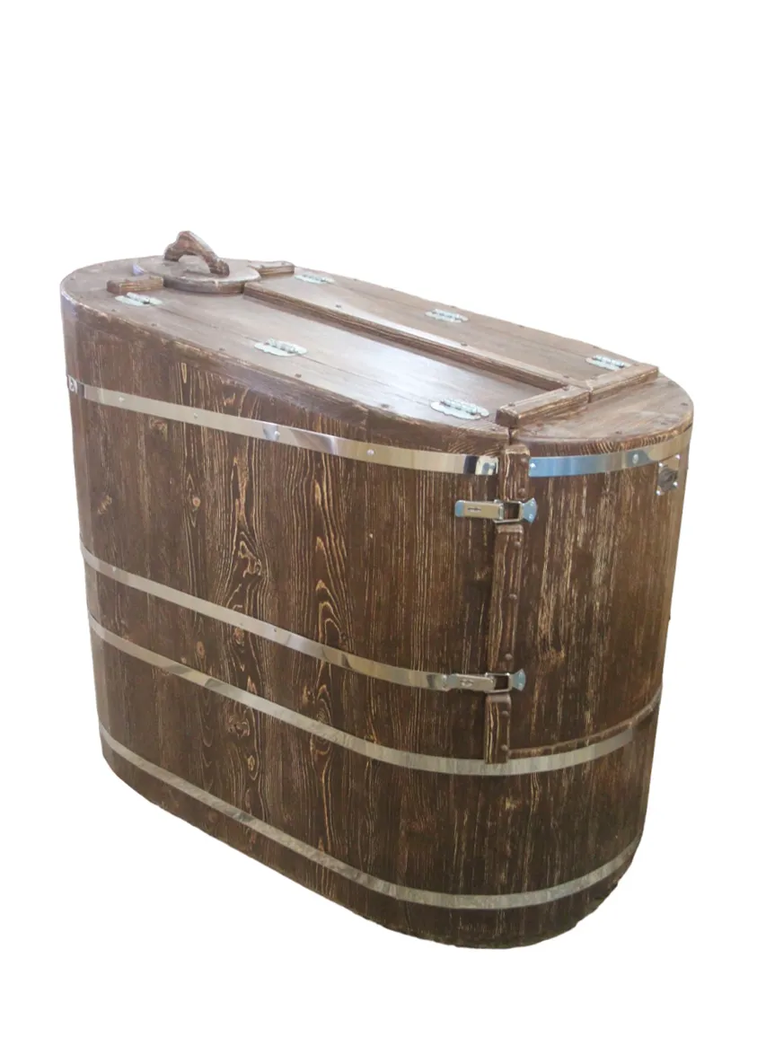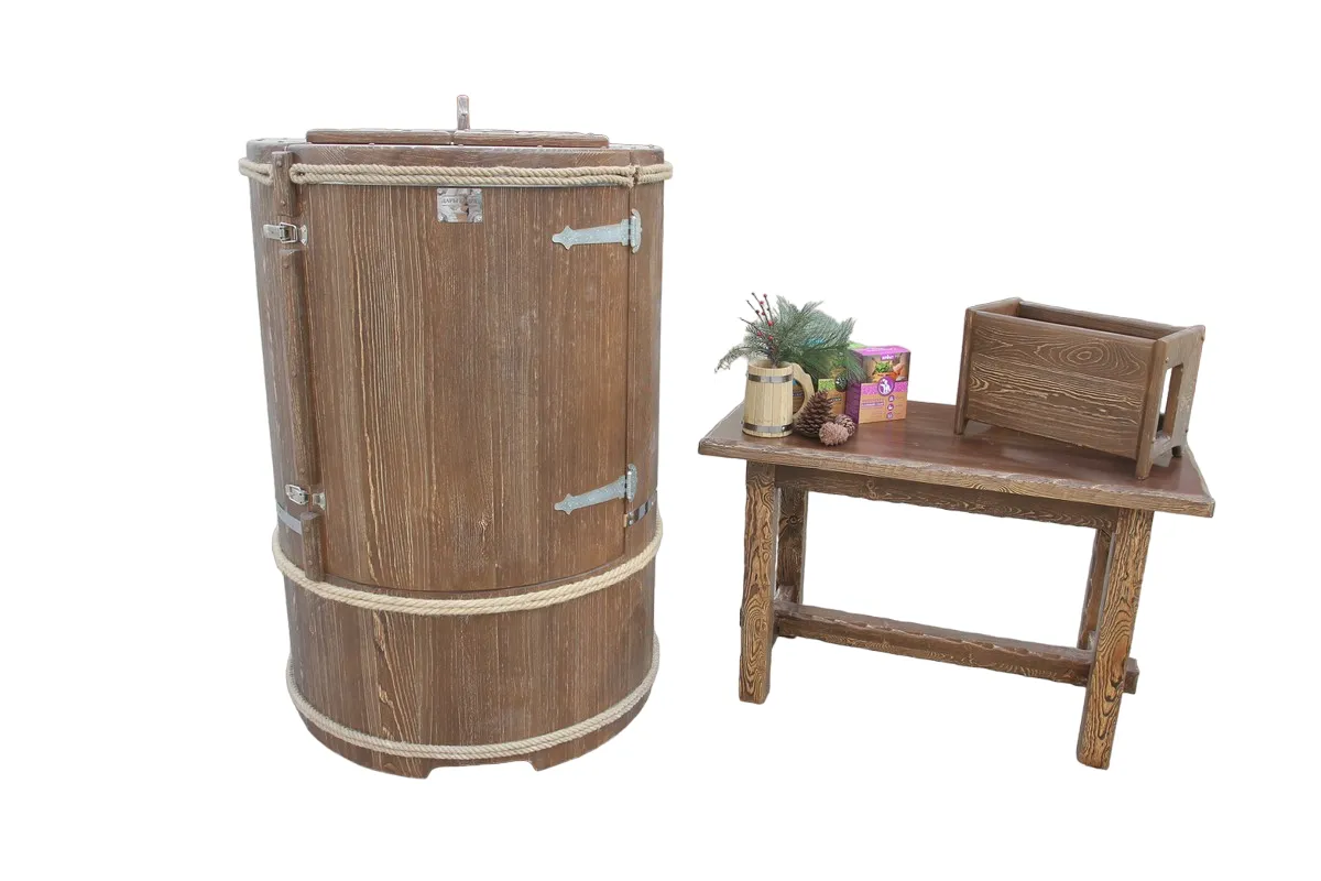 Готовый комплект - это полностью укомплектованный набор с фитобочкой для процедур парения. Овальная модель более просторна и удобна в использовании. Толщина стенок составляет 40-45 мм, что позволяет увеличить срок службы изделия. Верхний скос делает положение головы более комфортным и улучшает обзор. Фитобочка оборудована откидными створками, дверцей и отверстием для головы. Во время парения человек сидит внутри кедровой бочки, а голова находится снаружи. Благодаря этому исключается возможность перегрева. Подлокотники из кедра, встроенные ручки на створках и двери делают эксплуатацию более удобной.