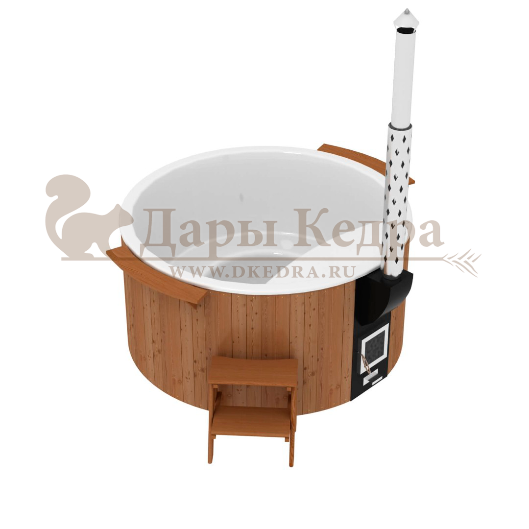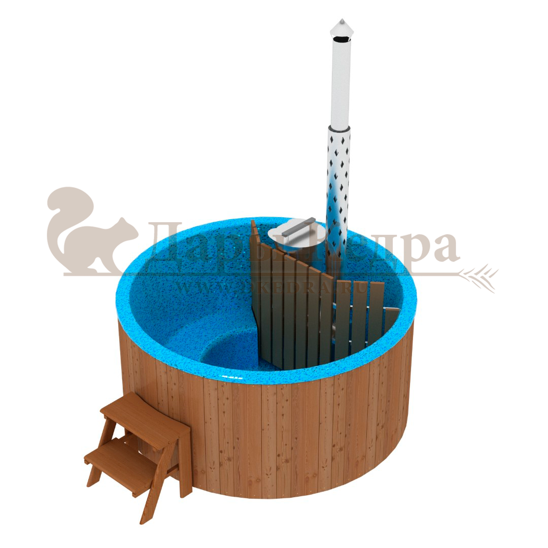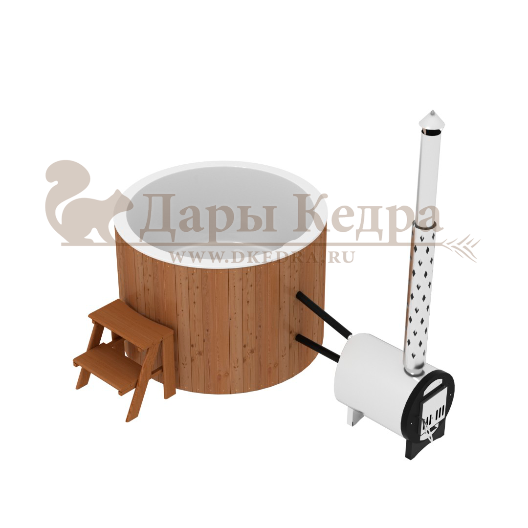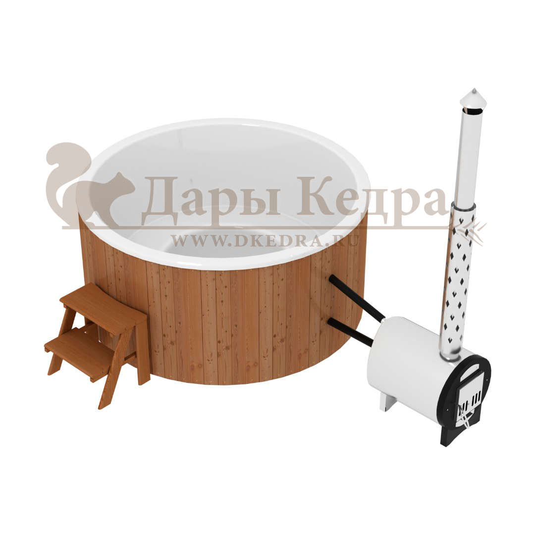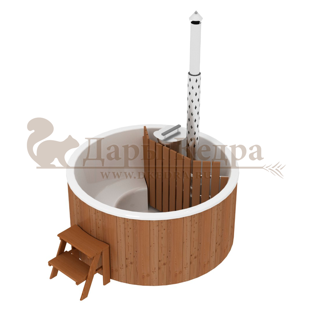 Финская круглая композитная купель с подогревом (с печкой) «Премиум 220 40 квт» Это уличная подогреваемая купель с круглой внутренней чашей, которая изготовлена из современного прочного и термоустойчивого материала (композита). Форма чаши обеспечивает комфортную посадку во время принятия процедур. Для удобства пользования купель фурако оборудована приставной лестницей. Нагрев воды осуществляется за счет встроенной печи, которая находится внутри купели за перегородкой из кедра. В комплектацию этой модели входит савок с длинной ручкой, который позволяет извлекать угли после эксплуатации изделия. Композитная вставка придает купели красивый внешний вид, продлевает срок службы и облегчает уход за изделием. Парение на свежем воздухе – это отличный способ укрепить здоровье и поддержать организм в тонусе.