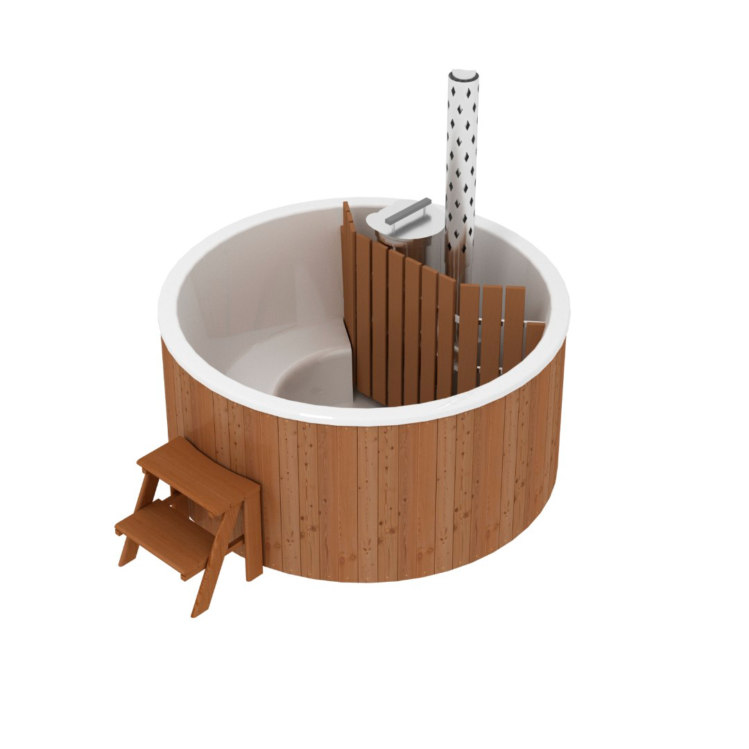 Финская круглая композитная купель с подогревом (с печкой) «Премиум 220 30 квт» Это уличная подогреваемая купель с круглой внутренней чашей, которая изготовлена из современного прочного и термоустойчивого материала (композита). Форма чаши обеспечивает комфортную посадку во время принятия процедур. Для удобства пользования купель фурако оборудована приставной лестницей. Нагрев воды осуществляется за счет встроенной печи, которая находится внутри купели за перегородкой из кедра. В комплектацию этой модели входит савок с длинной ручкой, который позволяет извлекать угли после эксплуатации изделия. Композитная вставка придает купели красивый внешний вид, продлевает срок службы и облегчает уход за изделием. Парение на свежем воздухе – это отличный способ укрепить здоровье и поддержать организм в тонусе.